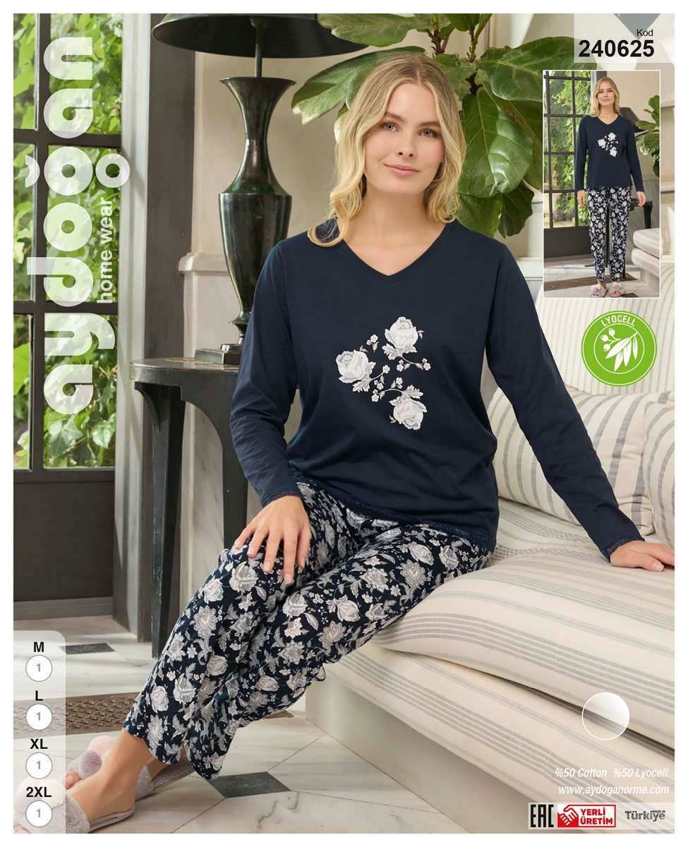 Комплект трикотажный: однотонная футболка c V-образной горловиной, длинным рукавом и отделкой кружевом, брюки свободного кроя с цветочным рисунком.