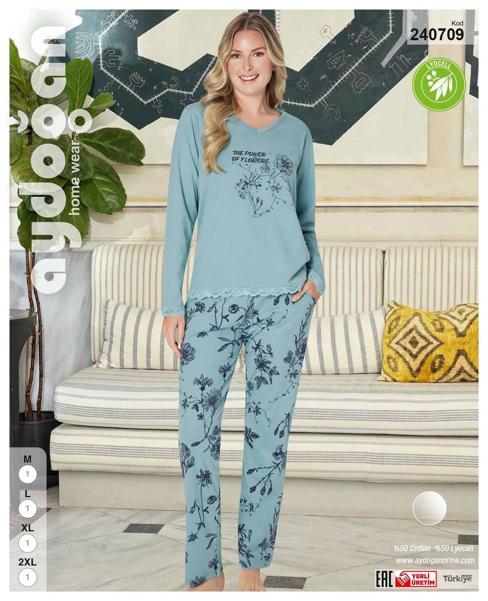 Комплект трикотажный: однотонная футболка c V-образной горловиной, длинным рукавом и отделкой кружевом, брюки свободного кроя с цветочным рисунком.