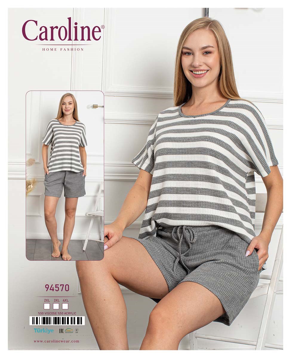 Костюм для отдыха из трикотажа крупной вязки. Свободные однотонные шорты с карманами и футболка в полоску с цельнокроенный коротким рукавом.