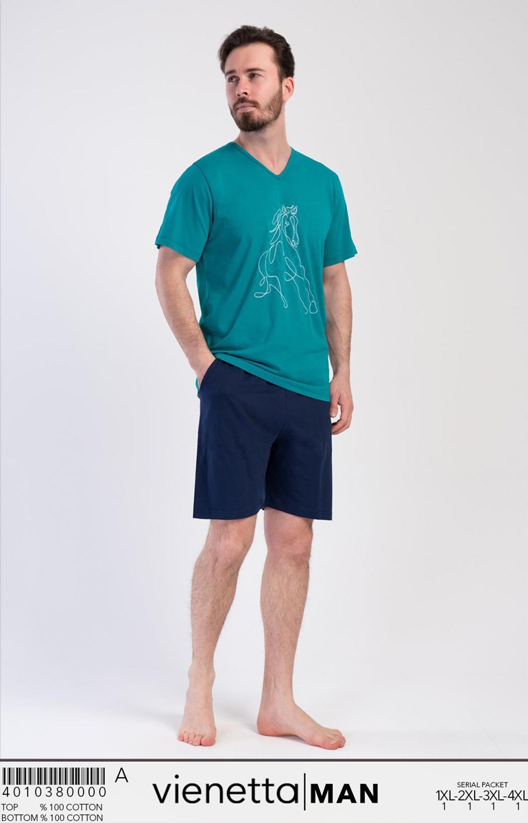 Комплект трикотажный: футболка c V-вырезом и однотонные шорты с карманами.