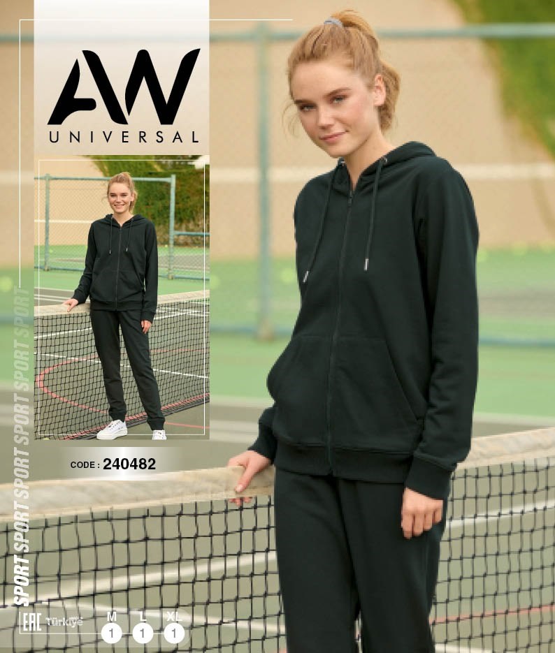 Костюм для отдыха. Кофта на молнии с капюшоном, брюки с карманами и манжетами.