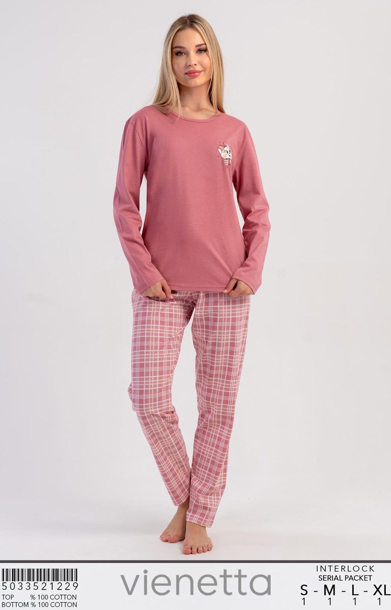 Домашний костюм из плотного трикотажа: однотонная футболка с длинным рукавом и брюки в клетку.
