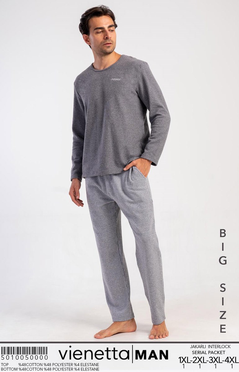 Мужской домашний костюм из плотного мягкого трикотажа. Однотонная кофта и брюки в мелкую клетку с карманами.