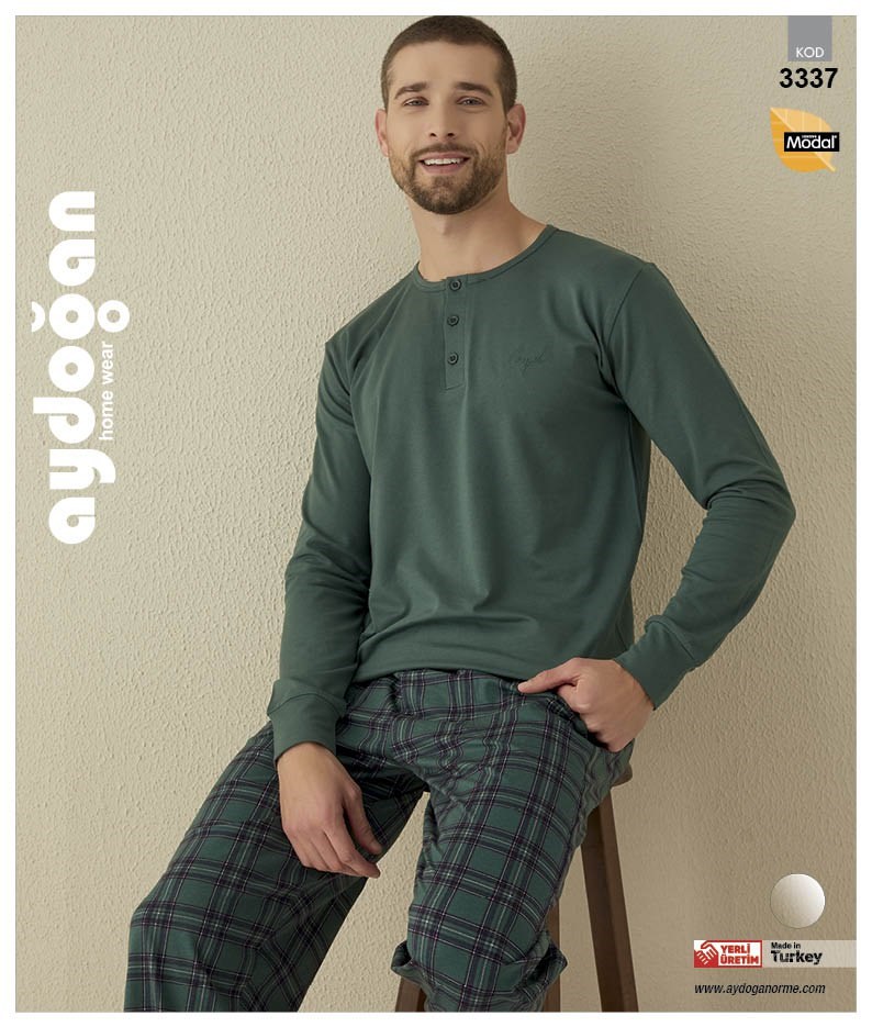 Комплект трикотажный мужской: однотонная футболка с длинным рукавом и клетчатые брюки с карманами.
