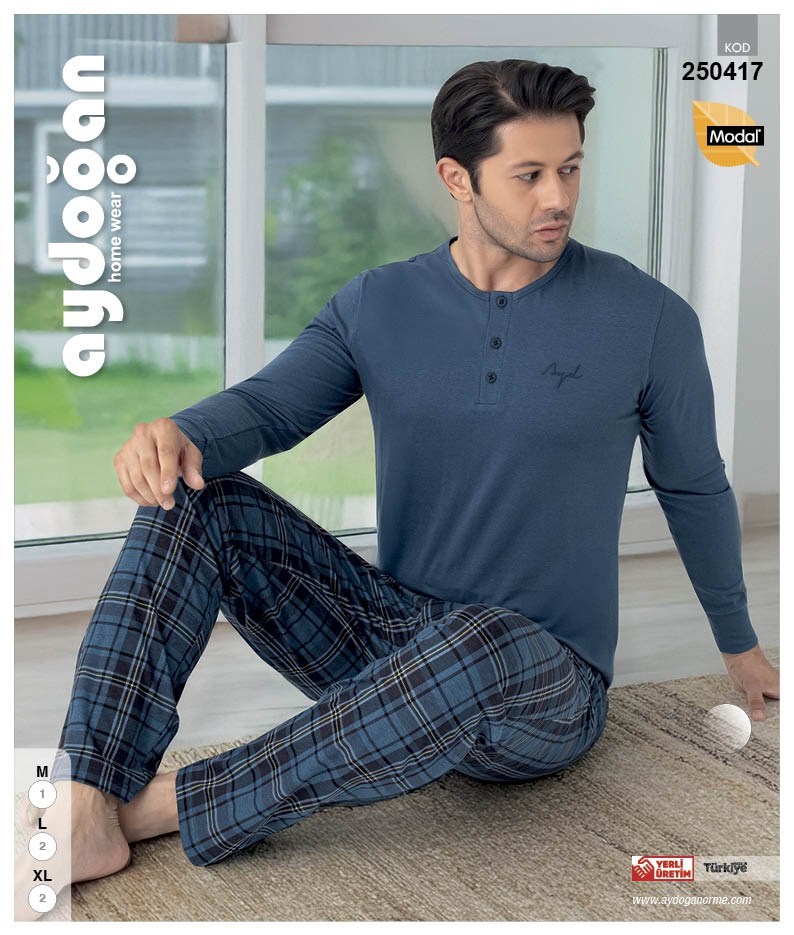 Комплект трикотажный мужской: однотонная футболка с длинным рукавом и клетчатые брюки с карманами.