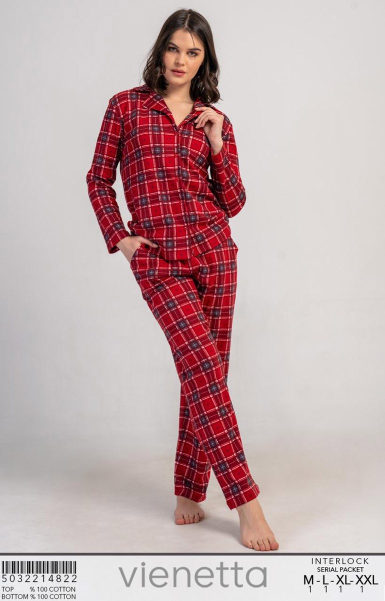 Классическая пижама в клетку из плотного х/б трикотажа (интерлок) - рубашка с отложным воротником и свободные брюки.